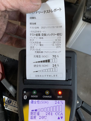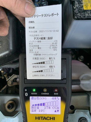 お知らせ · 2021/11/10 バッテリーチェッカー こんにちは。 今日はバッテリーチェッカーの紹介です。 この日立製のバッテリーチェッカーわ優れ物です。 国産のバッテリーでしたらほぼ網羅しています。 外車のバッテリーでもいけます。 で今回はⅯ42のバッテリーを点検します。 Ⅿ42のバッテリーはアイドリングストップ機構用のバッテリーです。 このバッテリーの交換時期は約3年しかもたないバッテリーです。 最初の画像のが約2年使ったバッテリーです。 結構使っていますがまだまだ使える状態です。 下の段の画像が約3年程使ったバッテリーです。 1年でこれだけ違います。 これから寒くなるので皆さんも気おつけて下さい。 tagPlaceholderカテゴリ:
