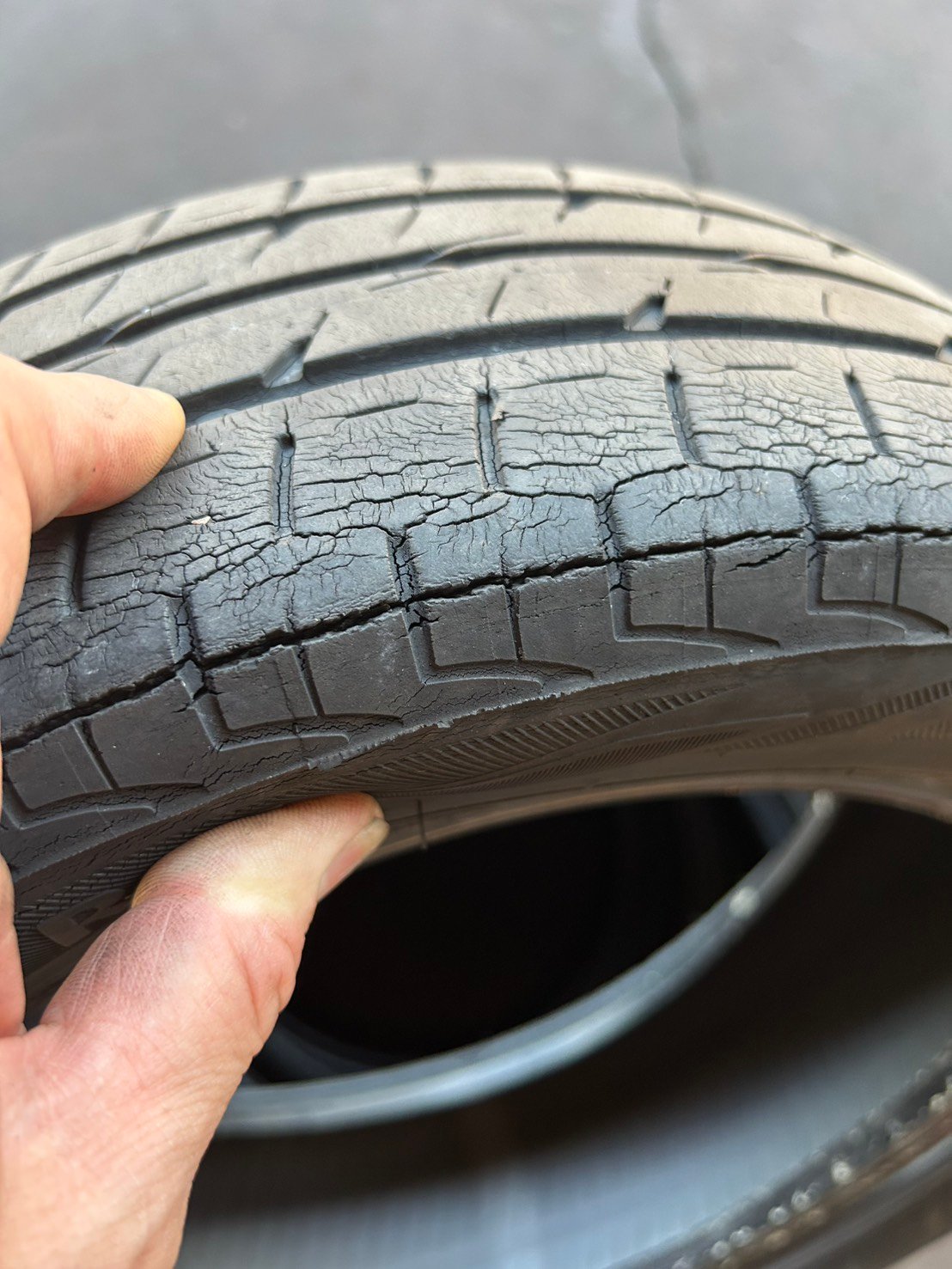 こんにちは。 今回はタイヤのひび割れについて改めてお知らせいたします。 タイヤはゴムでできているので劣化はします。特に紫外線が良くないです かと言って屋根付き駐車場があるのはごく一部です。だからこそ一年に一度は点検して欲しいです。タイヤのひび割れは約製造から5年程で出てくる感じですね。こちらのタイヤで高速道路を走行すと必ずバーストします。一般道でもなります。だからこそ溝があるので大丈夫と思わないで欲しいです。命がけの走行はしないでくださいね。宜しくお願い致します。