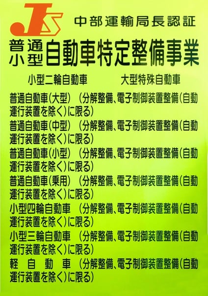 中部運輸局指定工場(民間車検工場)である当社は、国家整備士(2級4名/うち国家検査員3名)がプロフェッショナルな技術と考え方で、あなたの車の車検・修理を扱います。