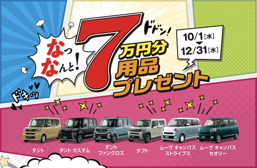 対象車種の新車をご成約のお客様に用品7万円分をプレゼントします。