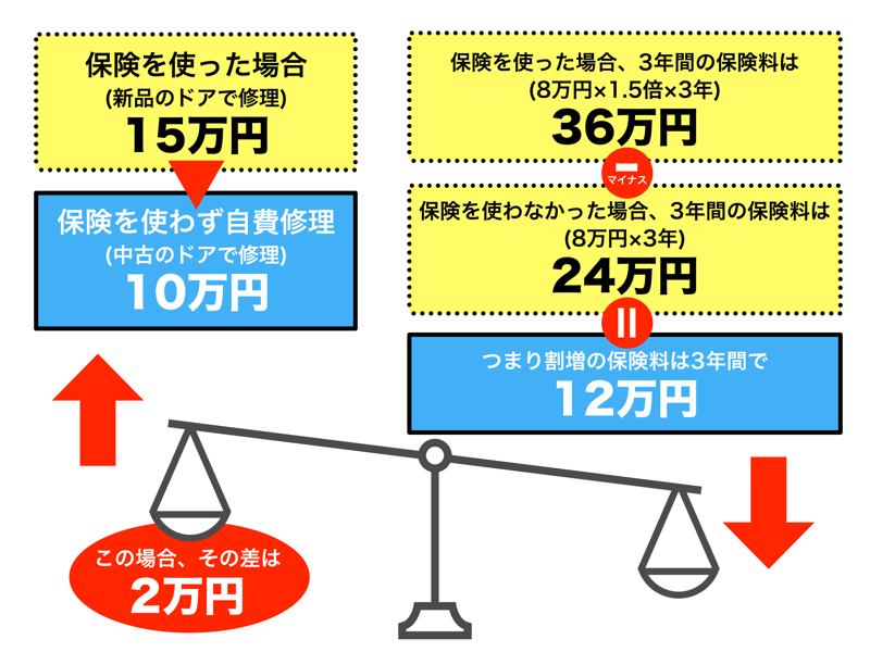 今回は中古のドアで修理して10万円の方が、割増の保険料より安くすむのでオススメです。今後の30万円以上の大きな事故に備えて、保険を温存できますし。 |